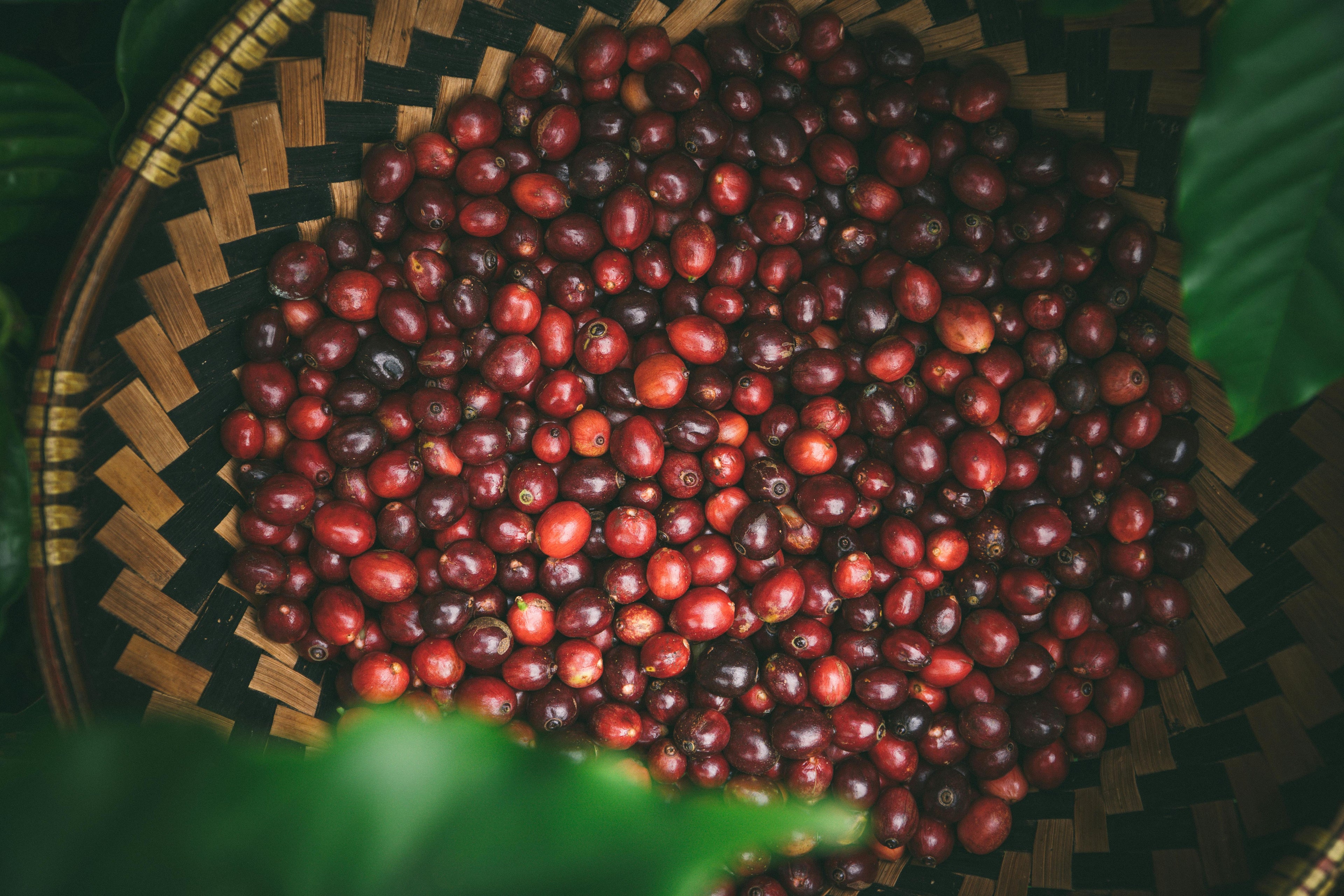 After picking, whole coffee cherries are spread out to dry; skin, flesh, and all.